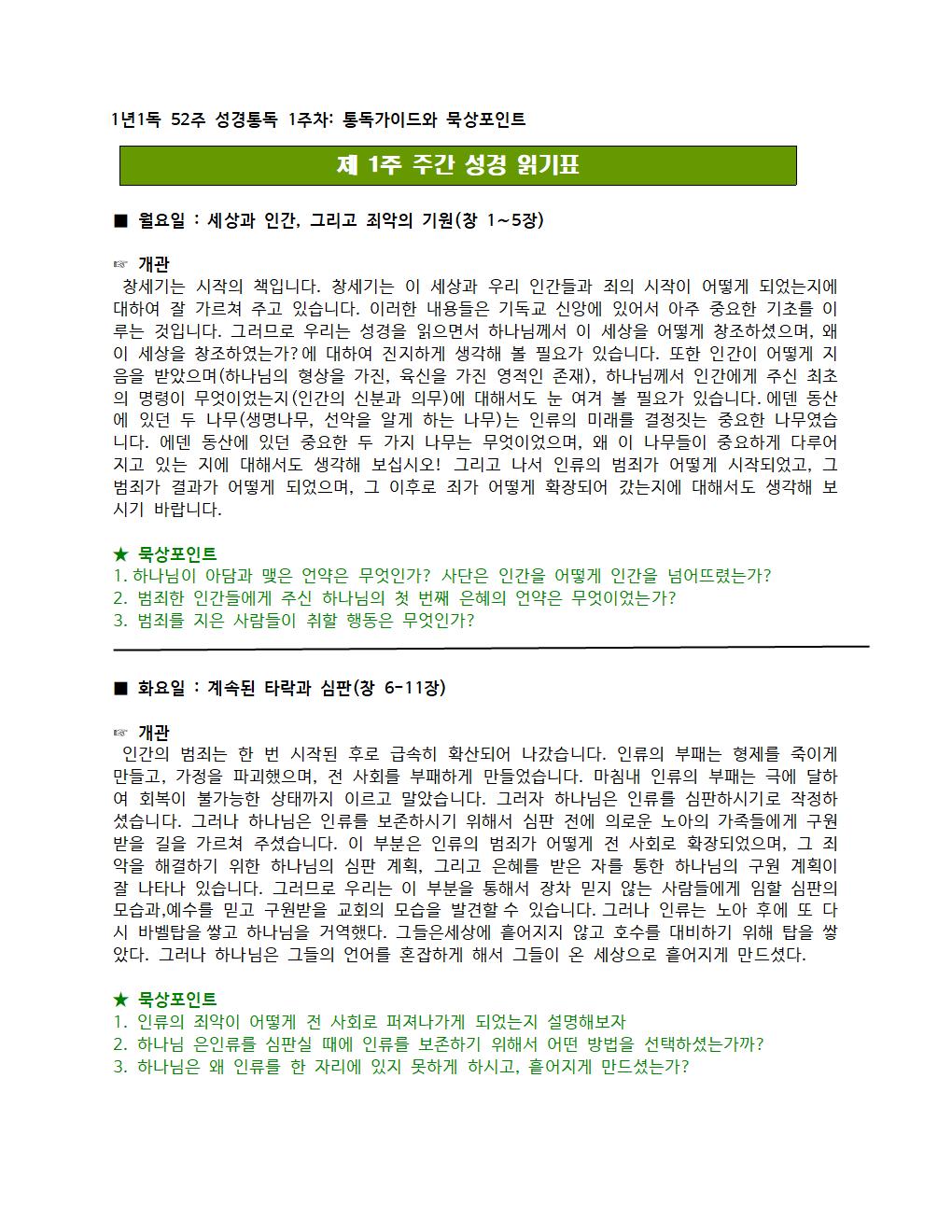 1년 1독 52주 성경가이드와 묵상포인트 1주차