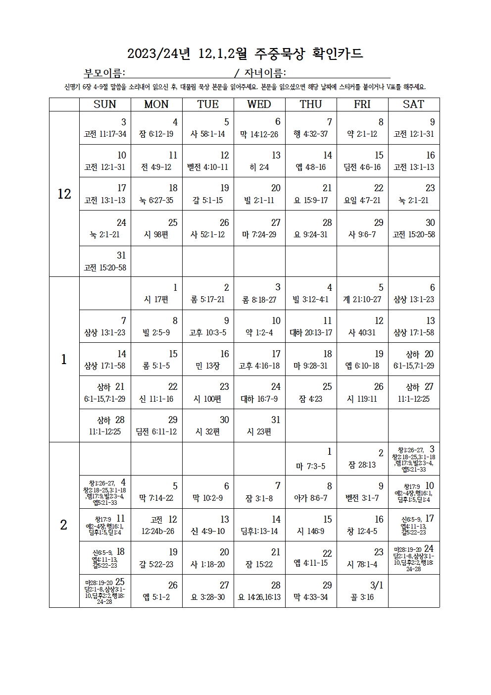 2023/24년 12,1,2월 주중묵상 확인카드