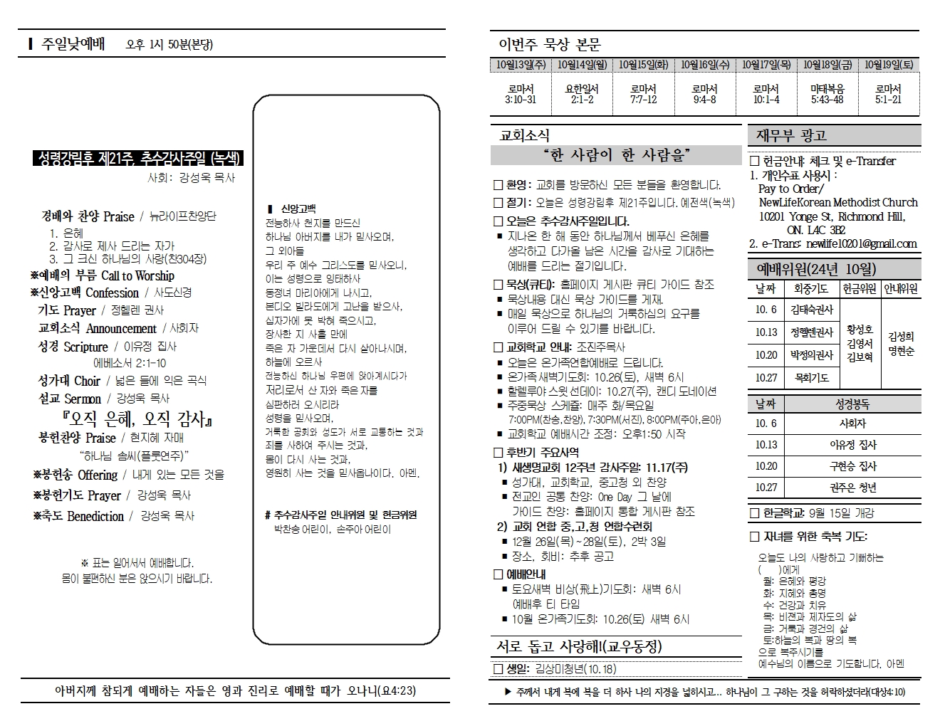 20241013 교회소식 및 주보 (추수감사주일)