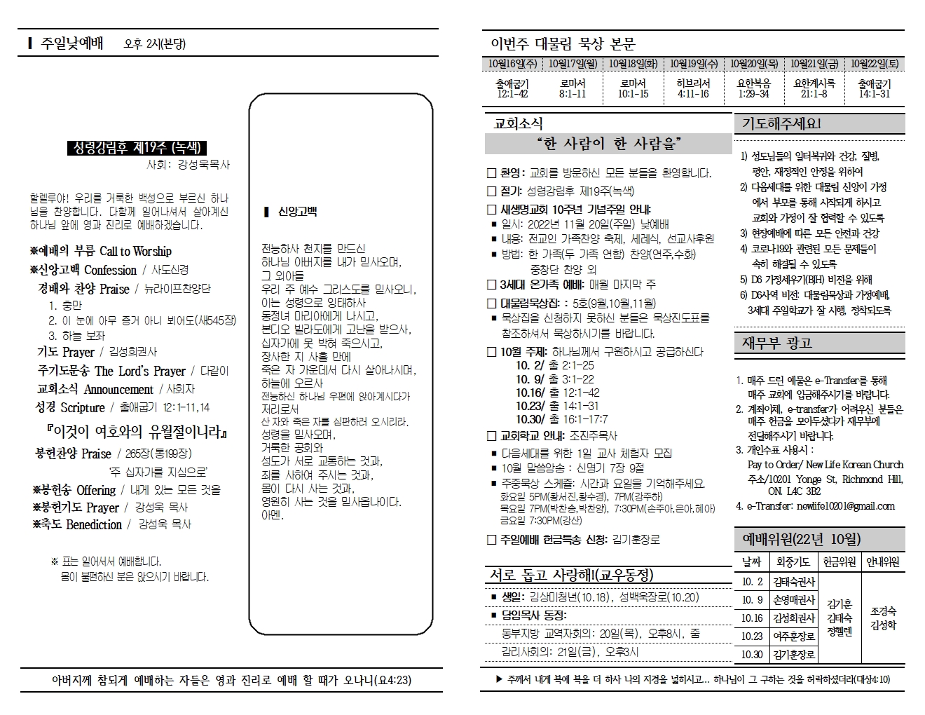 20221016 교회소식 및 주보