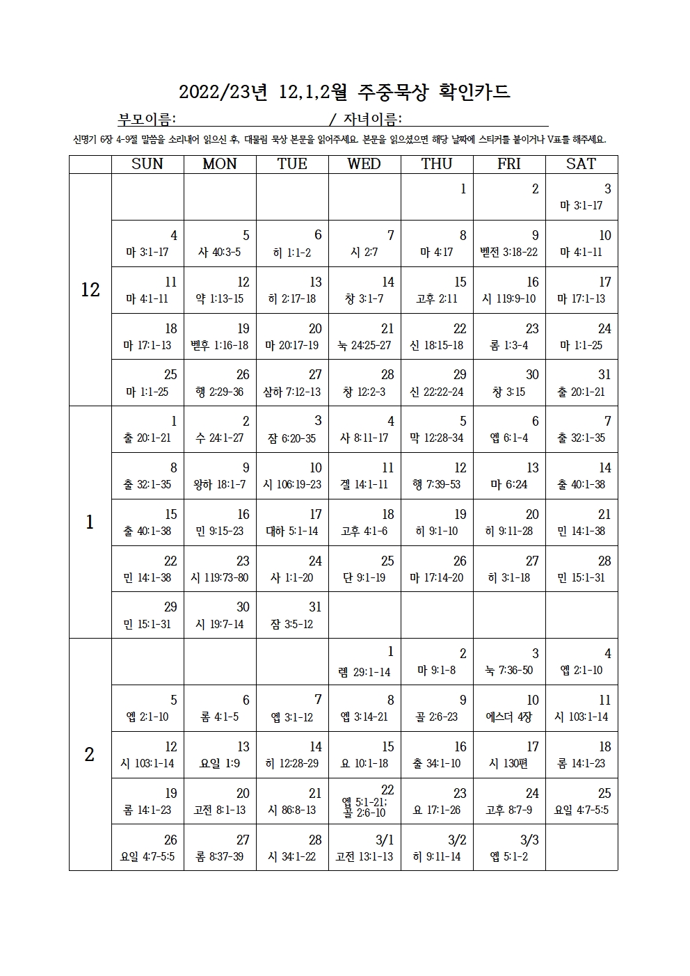 2022년 23년 12,1,2월 주중묵상 확인카드